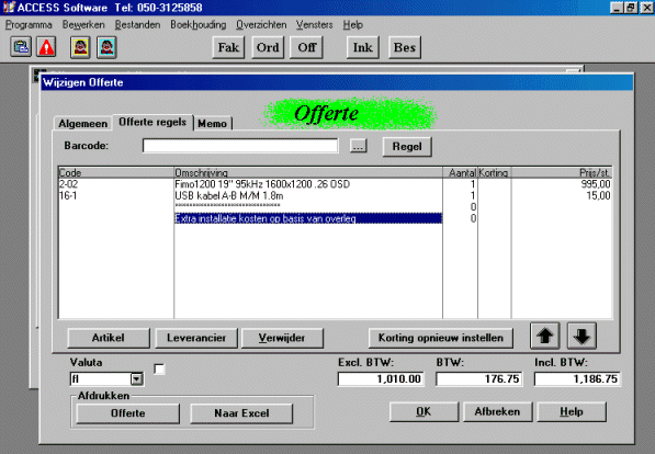 Offertes, orderbevestigingen, pakbonnen en verkoopfacturen lopen soepel in elkaar over, u kunt bovendien een kopie van een offerte maken voor een andere klant, zodat u nooit twee keer dezelfde gegevens hoeft in te voeren. Bestellingen naar leveranciers toe kunnen automatisch gegenereerd worden op basis van de openstaande orders en de bestaande voorraad. Kortingen kunnen per factuur regel gegeven worden. De offertes en facturen kunnen met een simpele muisklik in een andere valuta uitgedraaid worden, ook is uitdraai met twee valuta's mogelijk.